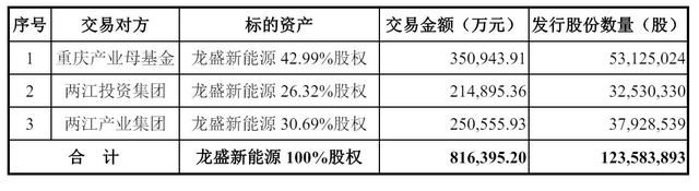 赛力斯日前发布财报,并披露通过发行股份的方式购买重庆产业母基金、两江投资集团、两江产业集团持有的龙盛新能源 100%股权一事的进展。龙盛新能源100%股权价值为81.64亿元。