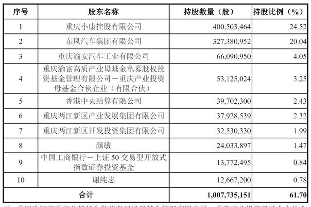 此次交易后,重庆小康控股有限公司(简称“小康控股”)持股24.52%,东风汽车公司持股20.04%,重庆渝安汽车工业有限公司(简称“渝安工业”)持股4.05%,重庆渝富高质产业母基金私募股权投资基金管理有限公司-重庆产业投资母基金合伙企业(有限合伙)持股为3.25%,香港中央结算有限公司持股为2.43%;
