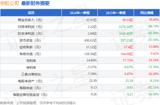 据证券之星公开数据整理,近期华虹公司(688347)发布2025年一季报。截至本报告期末,公司营业总收入39.13亿元,同比上升18.66%,归母净利润2276.34万元,同比下降89.73%。按单季度数据看,第一季度营业总收入39.13亿元,同比上升18.66%,第一季度归母净利润2276.34万元,同比下降89.73%。本报告期华虹公司公司应收账款体量较大,当期应收账款占最新年报归母净利润比达457.23%。