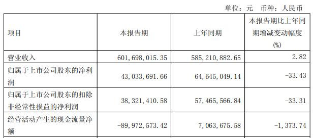 2025年第一季度,国茂股份实现营业收入6.02亿元,同比增长2.82%;归属于上市公司股东的净利润4303.37万元,同比下降33.43%;归属于上市公司股东的扣除非经常性损益的净利润3832.14万元,同比下降33.31%;经营活动产生的现金流量净额-8997.26万元,上年同期为706.37万元。