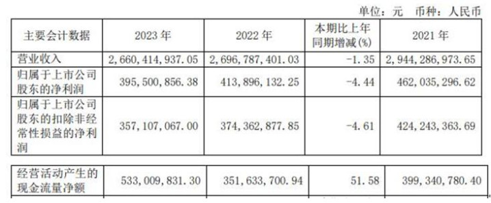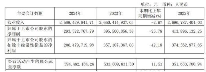 2022年、2023年、2024年,国茂股份实现归属于上市公司股东的净利润同比下降分别为10.42%、4.44%、25.78%;归属于上市公司股东的扣除非经常性损益的净利润同比下降分别为11.76%、4.61%、42.18%。